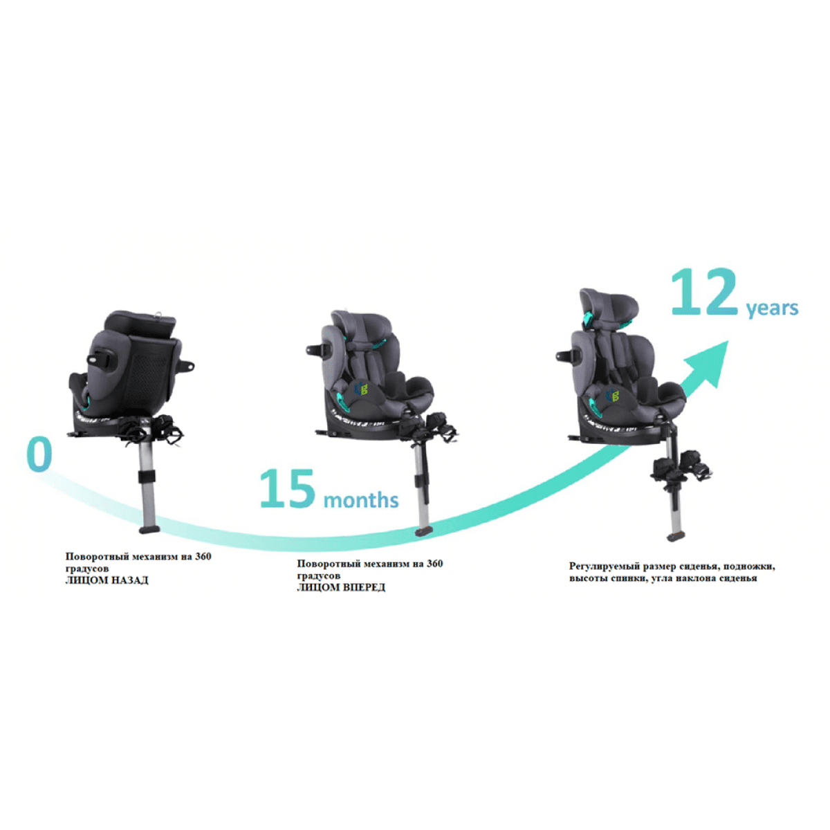 Спинка регулируется по высоте, благодаря чему кресло «растёт» вместе с ребёнком. Возможна установка как по ходу, так и против хода движения. Угол наклона сиденья также настраивается, что позволяет выбрать комфортное положение для отдыха. Подножка с фиксаторами стоп помогает правильно расположить ноги и повышает общий уровень поддержки.