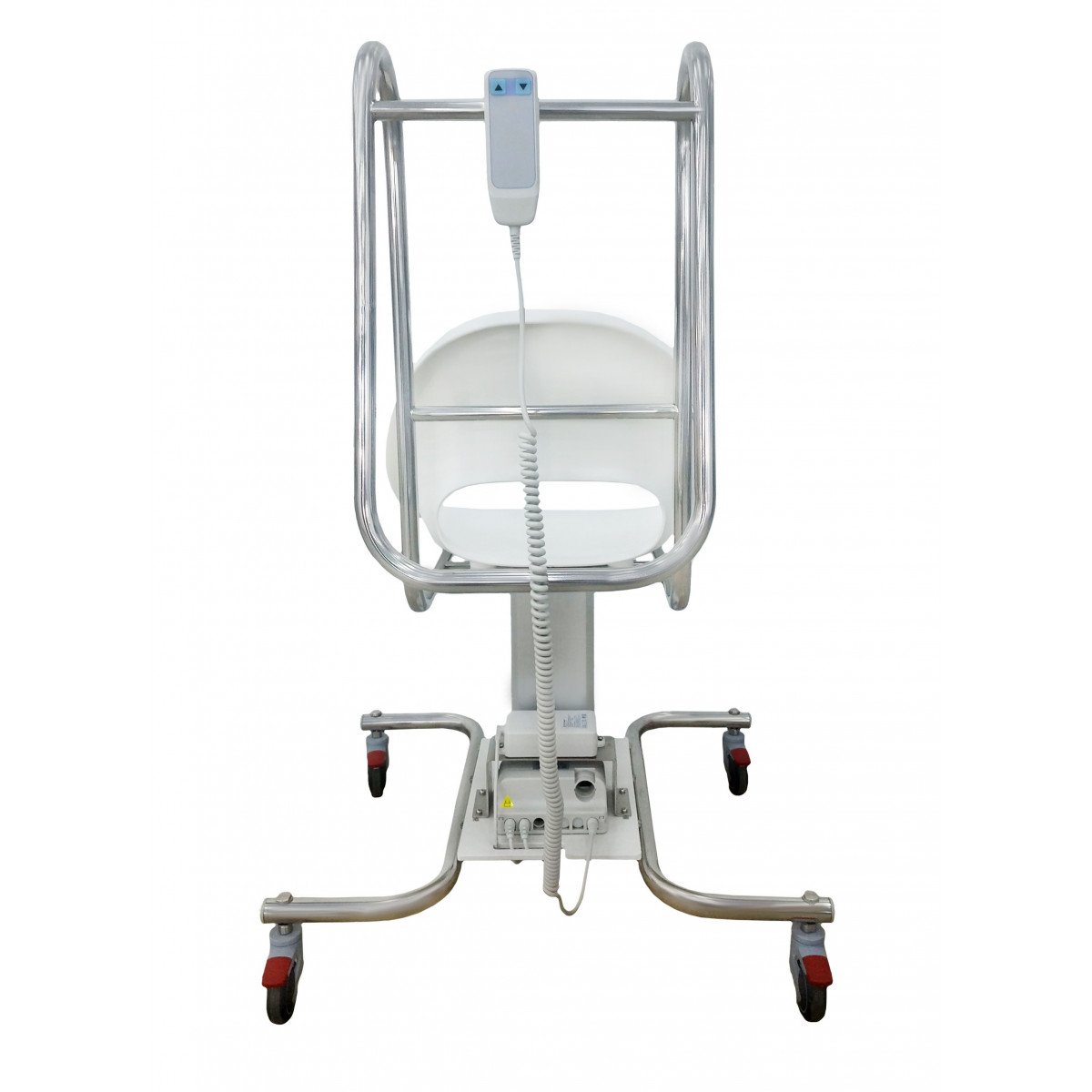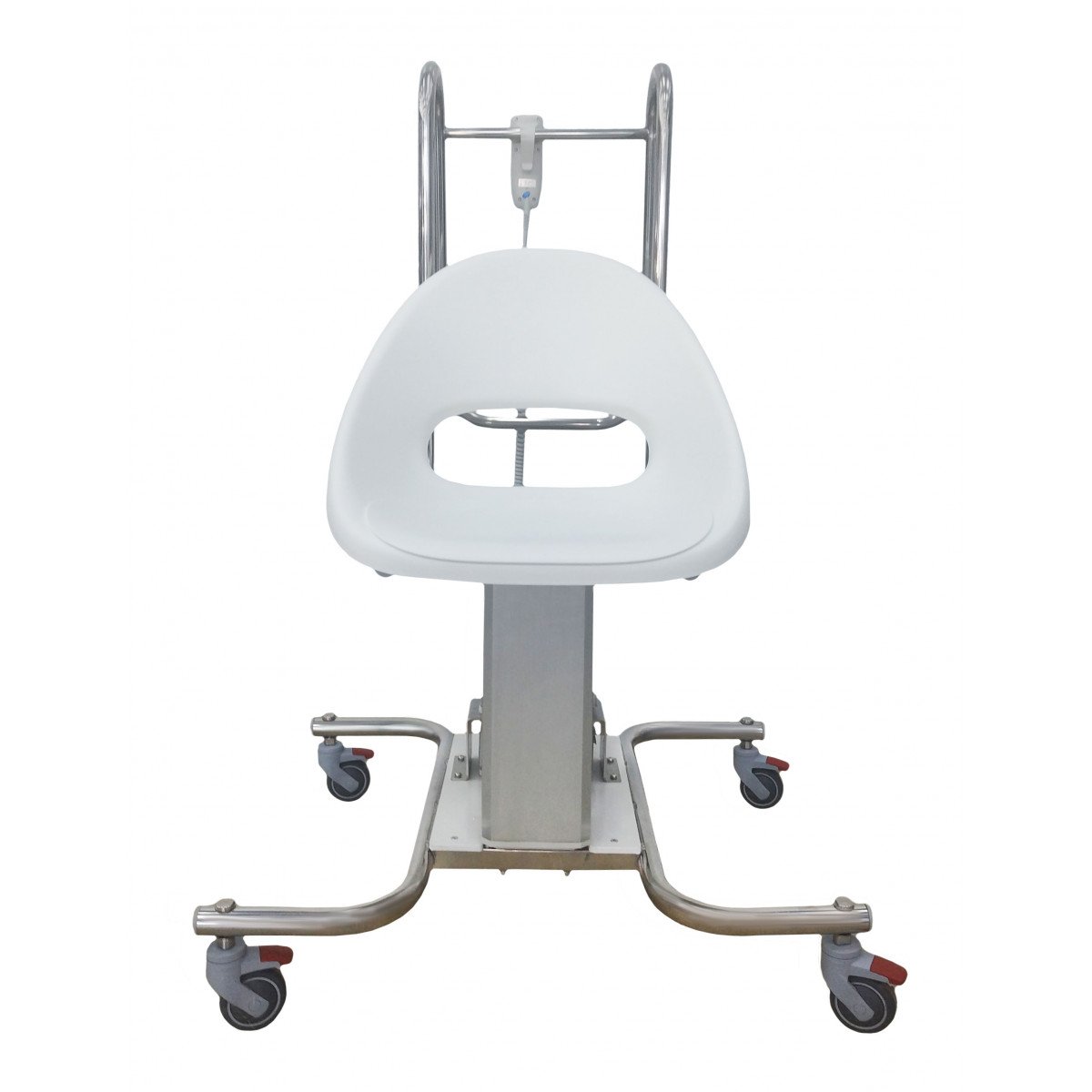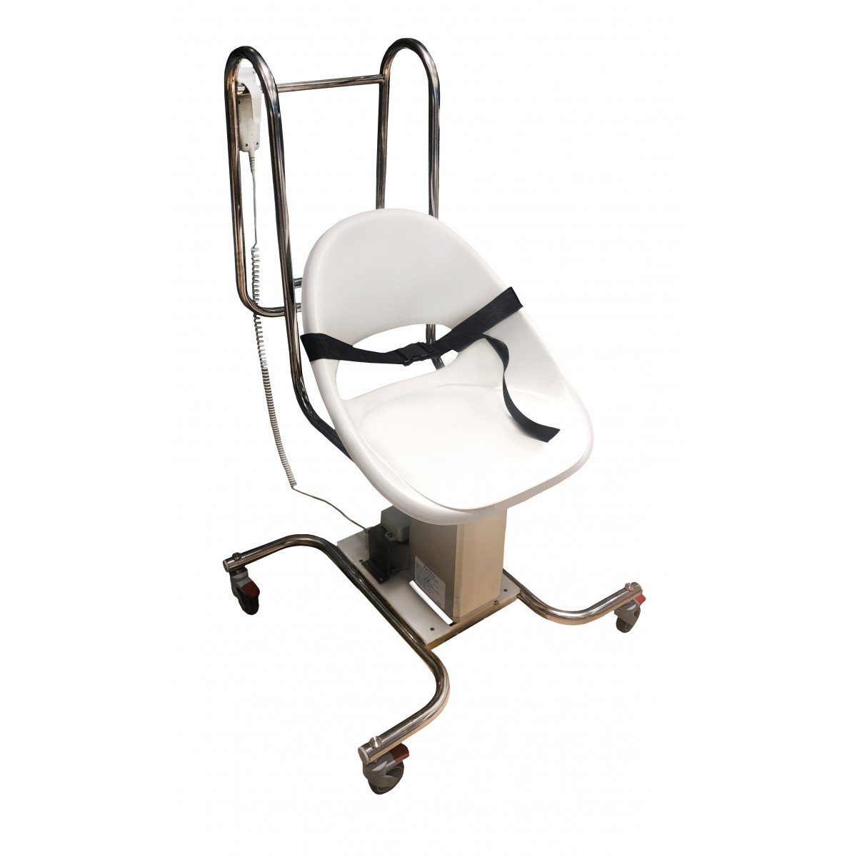 Конструкция оснащена электрическим приводом, плавно поднимающим и опускающим кресло в вертикальном направлении. Основные элементы выполнены из прочной нержавеющей стали, а удобное сиденье надёжно закреплено на станине. Манёвренные поворотные колёса позволяют легко перемещать устройство даже в маленьких кабинетах, а эргономичная ручка помогает персоналу контролировать движение без усилий. Съёмный пульт управления делает работу с подъёмником простой и безопасной.