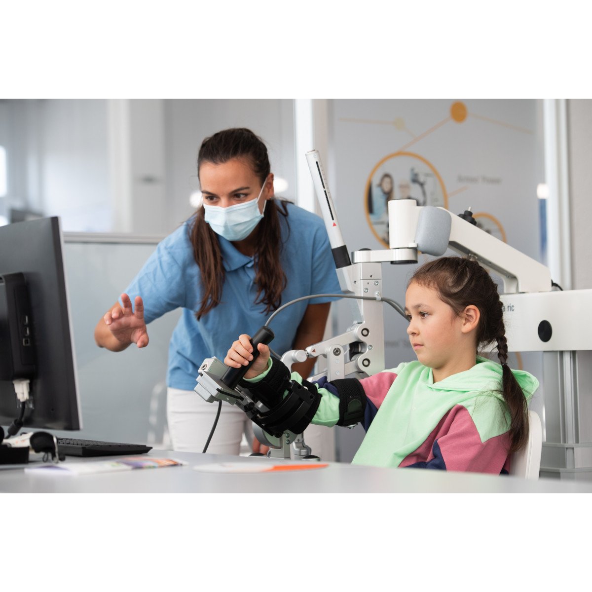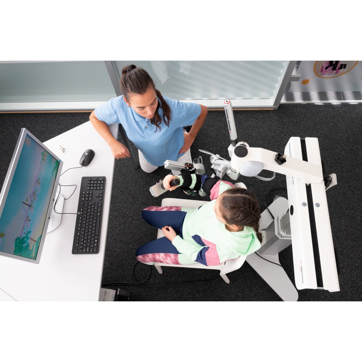 Тренировки основаны на принципах нейропластичности и включают повторяющиеся функциональные движения, приближённые к повседневной активности. Система компенсирует вес руки, поэтому даже дети с минимальной сохранённой мышечной силой могут выполнять упражнения самостоятельно. Занятия проходят в виртуальной 3D-среде с мотивирующими заданиями и играми, что повышает вовлечённость и устойчивый интерес к терапии.