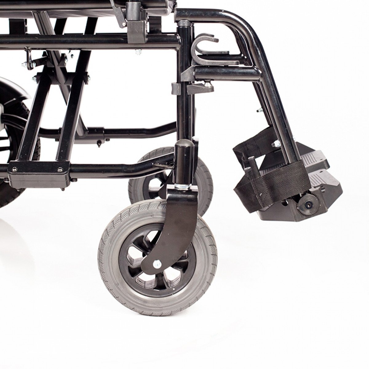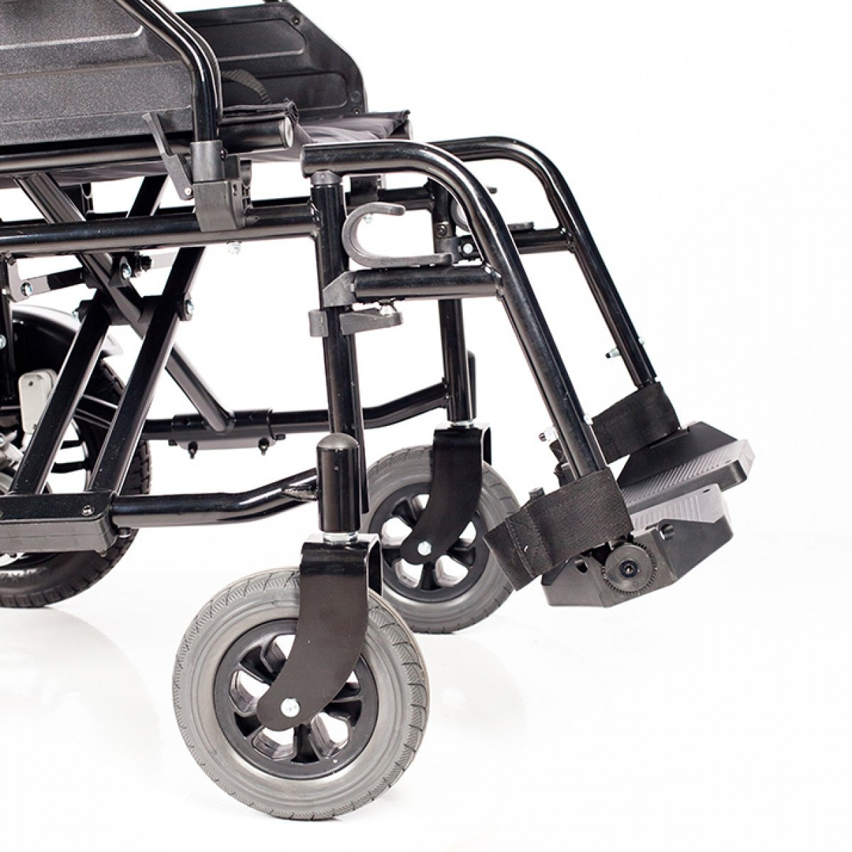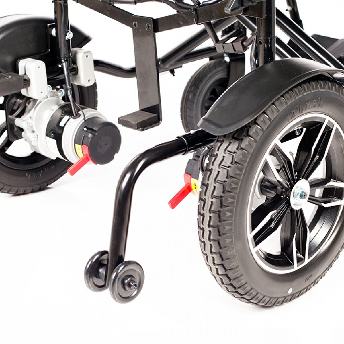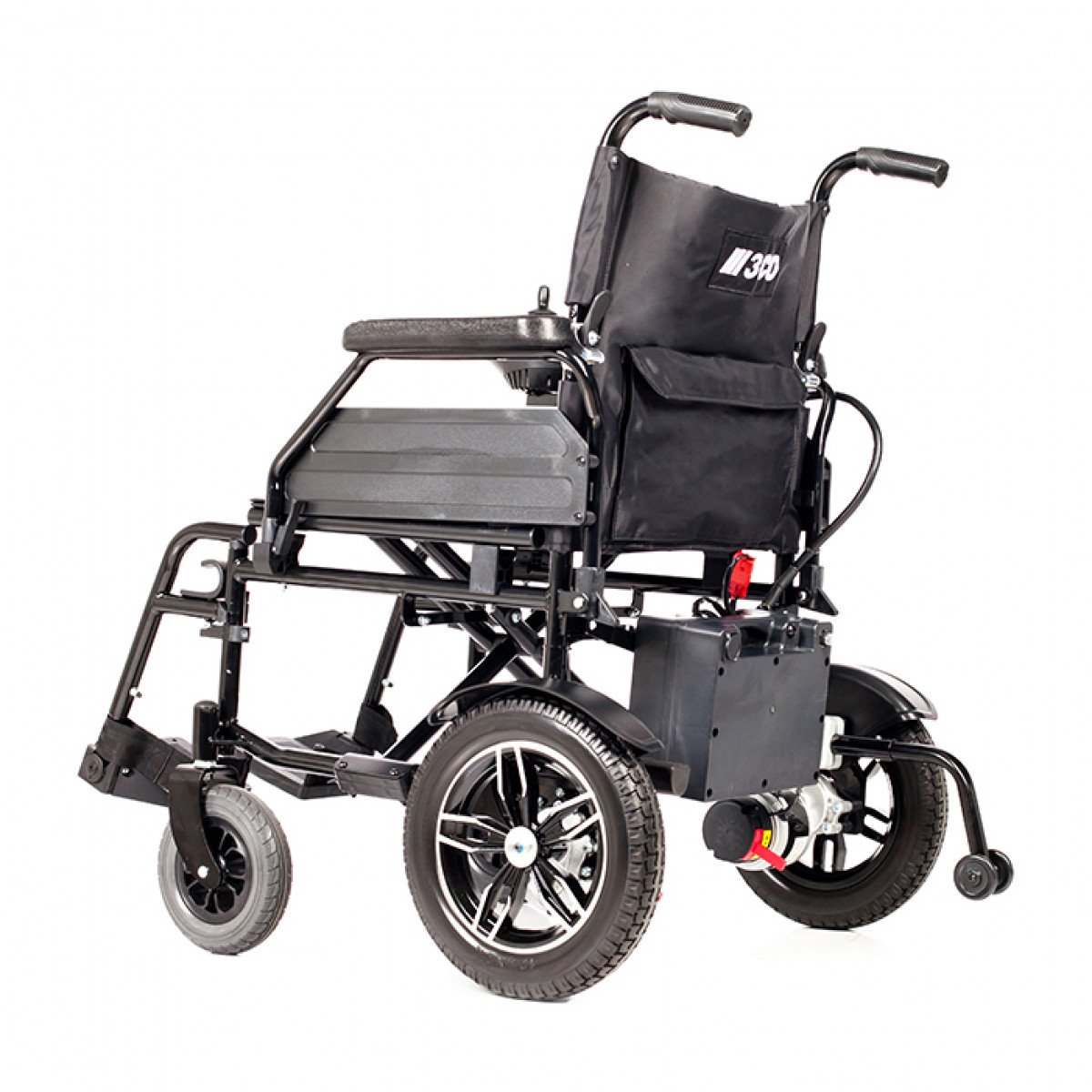 Рама изготовлена из стали с антикоррозийным покрытием, что обеспечивает надёжность конструкции. Коляска оснащена цельнолитыми колёсами, не требующими обслуживания. Два аккумулятора размещены под сиденьем и не требуют сложного ухода. Для безопасности предусмотрены ремень фиксации, стояночный тормоз и антиопрокидыватели с регулировкой по высоте. Складной механизм позволяет компактно хранить и перевозить коляску.