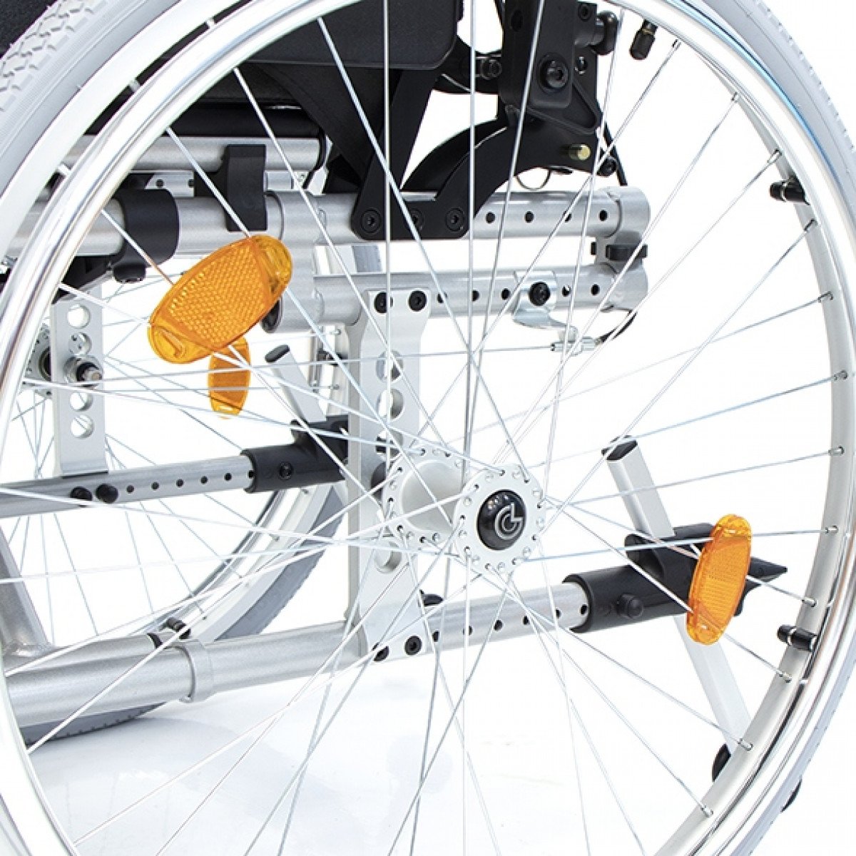 Коляска позволяет точно адаптировать положение пользователя: спинка регулируется по высоте и углу наклона и оснащена боковыми фиксаторами для поддержки корпуса. Сиденье настраивается по высоте, глубине и наклону, что помогает снизить нагрузку и подобрать удобную посадку. Подлокотники регулируются, при необходимости снимаются или откидываются, упрощая пересаживание.