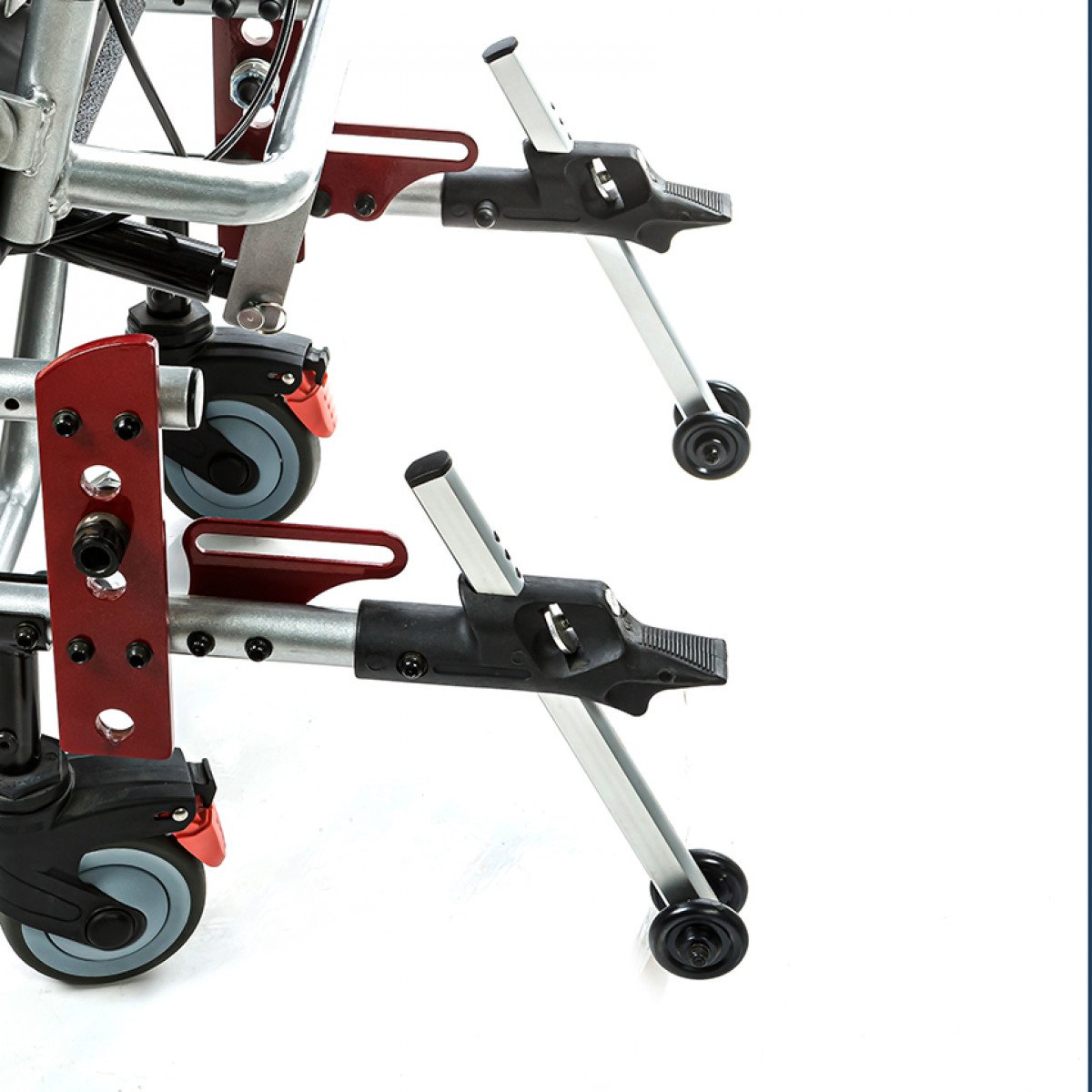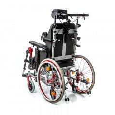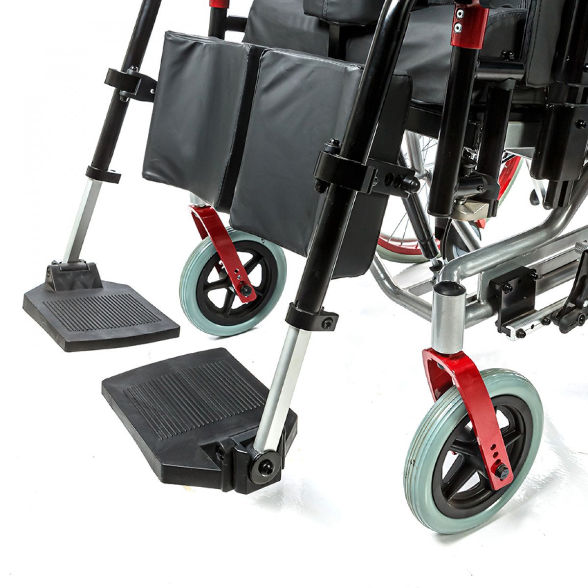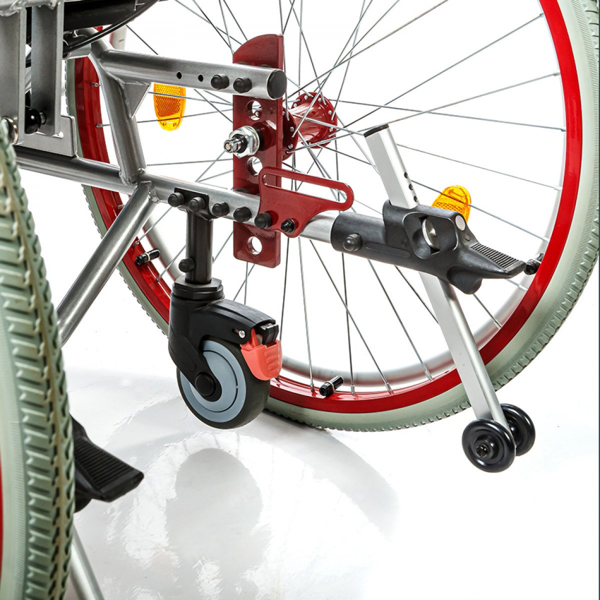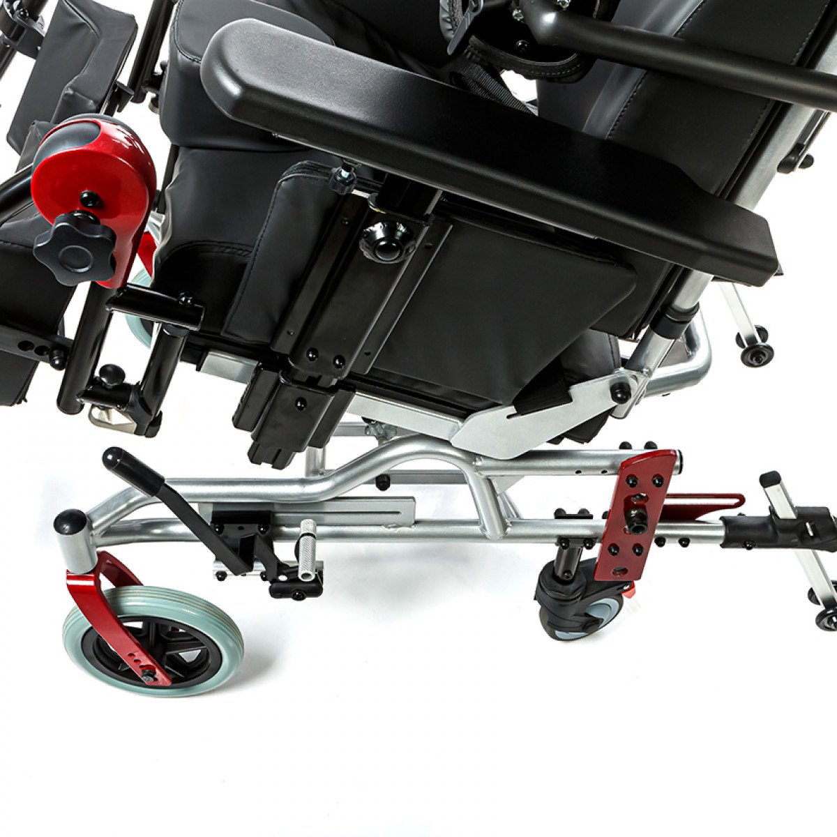 Подножки регулируются по высоте и углу наклона, оснащены мягкими ложементами и упорами для коленей для дополнительной фиксации. Раздельные опоры для стоп можно настроить по положению. Передние и задние колёса доступны в вариантах: цельнолитые или пневматические — под разные условия эксплуатации. Для устойчивости предусмотрены антиопрокидыватели с регулировкой по высоте. Прочная алюминиевая рама с антикоррозийным покрытием рассчитана на длительное использование.