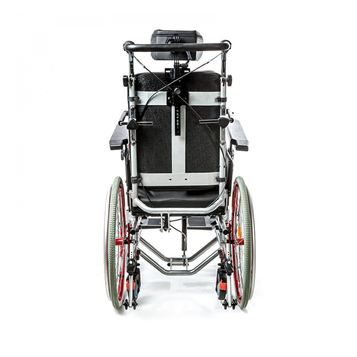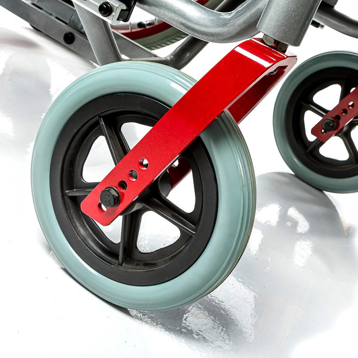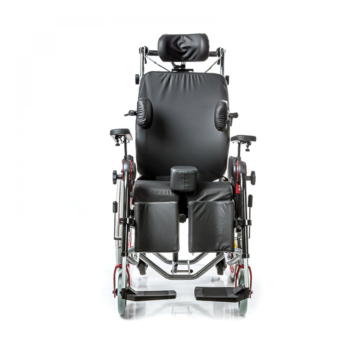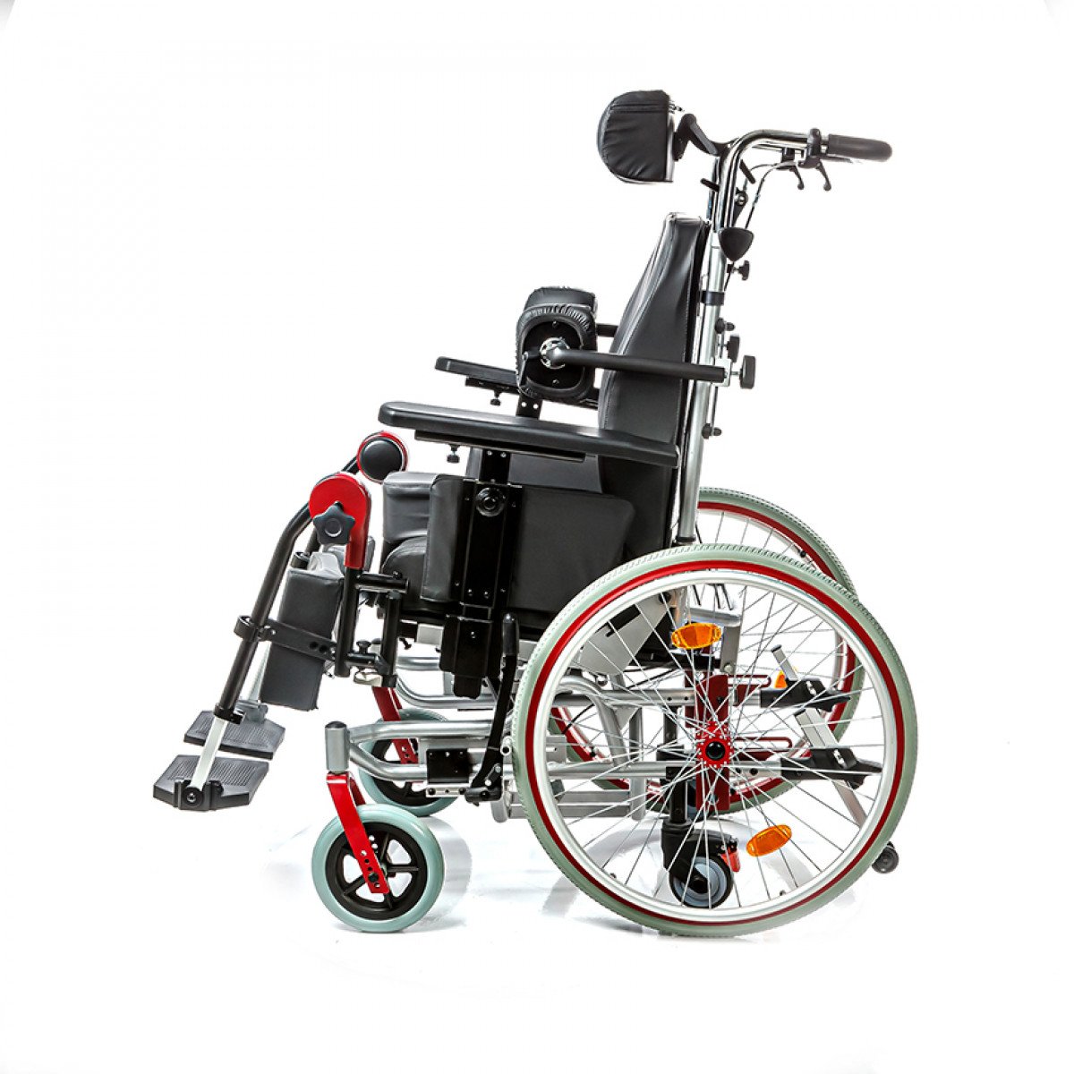 Подножки регулируются по высоте и углу наклона, оснащены мягкими ложементами и упорами для коленей для дополнительной фиксации. Раздельные опоры для стоп можно настроить по положению. Передние и задние колёса доступны в вариантах: цельнолитые или пневматические — под разные условия эксплуатации. Для устойчивости предусмотрены антиопрокидыватели с регулировкой по высоте. Прочная алюминиевая рама с антикоррозийным покрытием рассчитана на длительное использование.