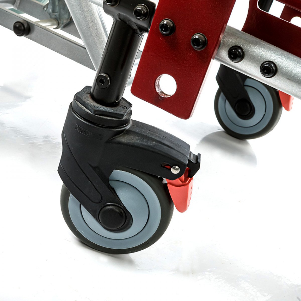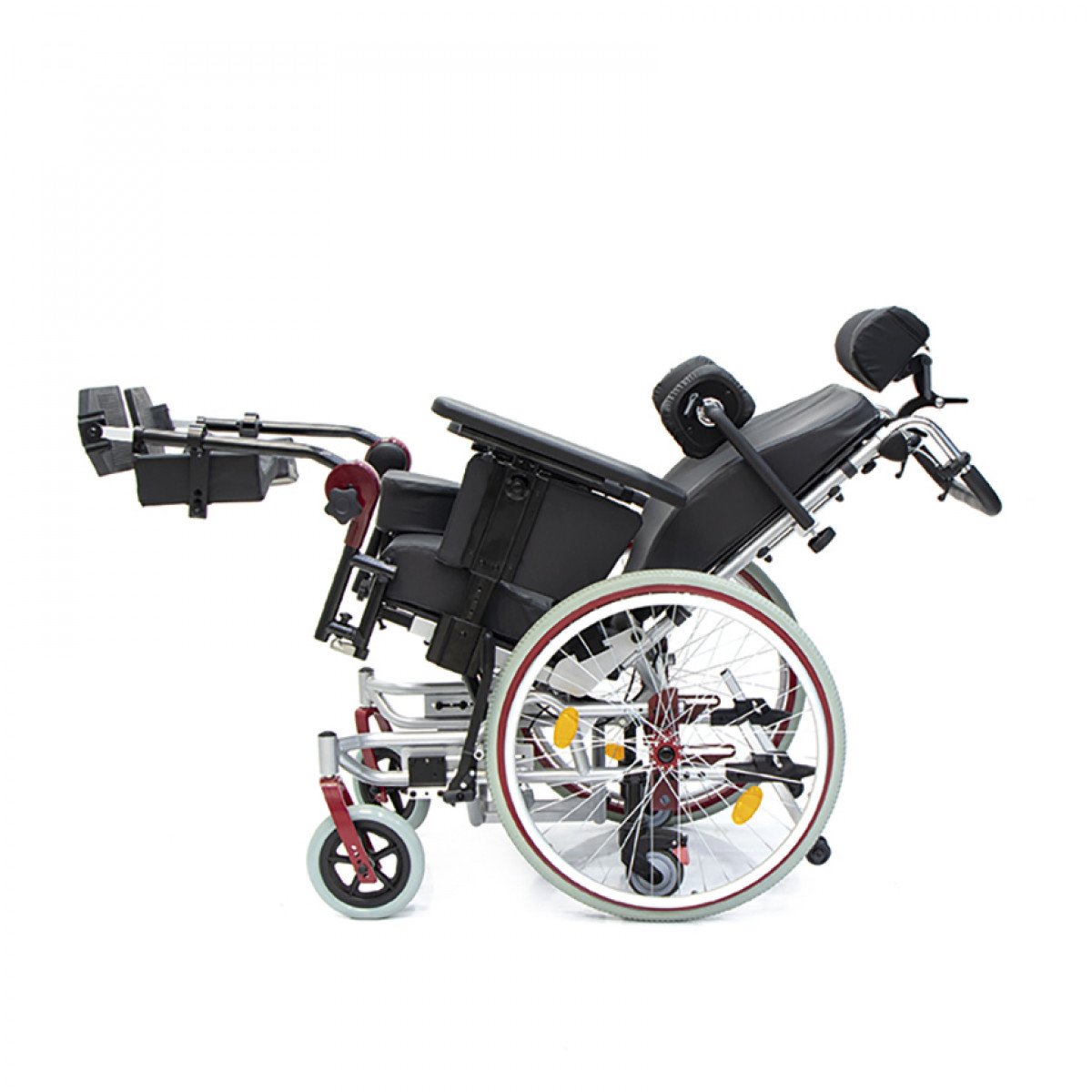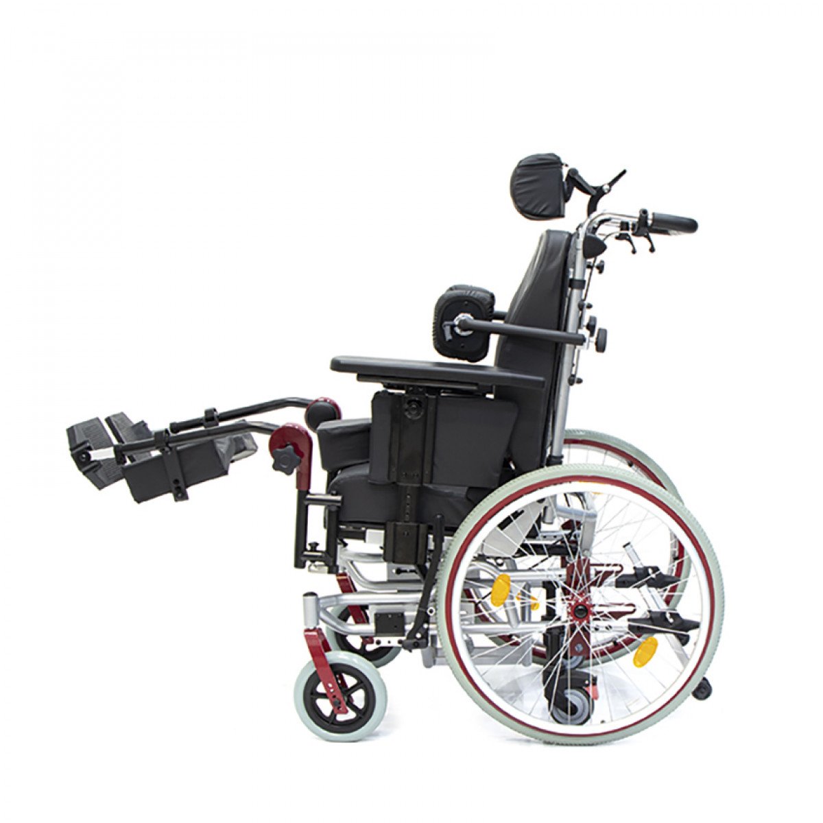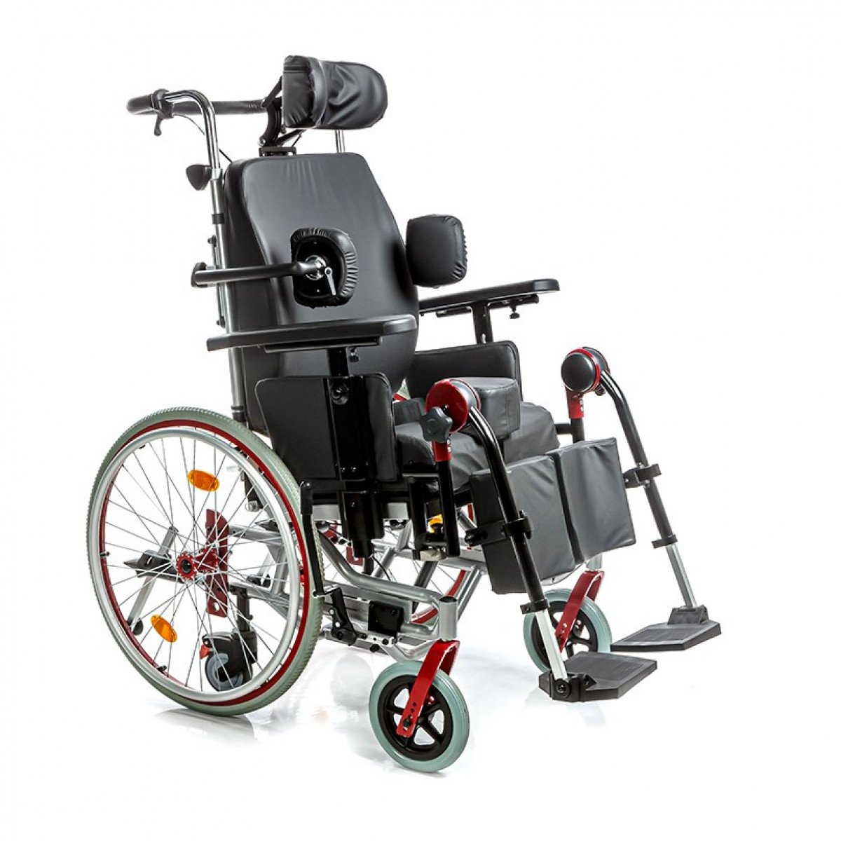 Подножки регулируются по высоте и углу наклона, оснащены мягкими ложементами и упорами для коленей для дополнительной фиксации. Раздельные опоры для стоп можно настроить по положению. Передние и задние колёса доступны в вариантах: цельнолитые или пневматические — под разные условия эксплуатации. Для устойчивости предусмотрены антиопрокидыватели с регулировкой по высоте. Прочная алюминиевая рама с антикоррозийным покрытием рассчитана на длительное использование.
