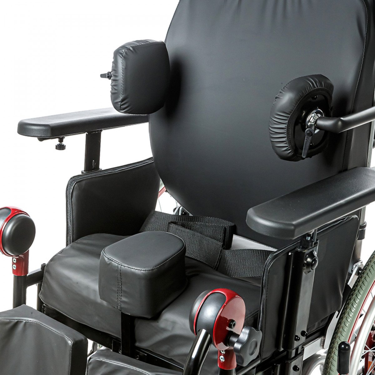Коляска позволяет точно настроить посадку: спинка регулируется по высоте и углу наклона и оснащена боковыми фиксаторами для поддержки корпуса. Сиденье настраивается по высоте, глубине и наклону, а подлокотники регулируются и при необходимости снимаются для удобного пересаживания. Ручки для сопровождающего также регулируются по высоте, что делает управление комфортнее.