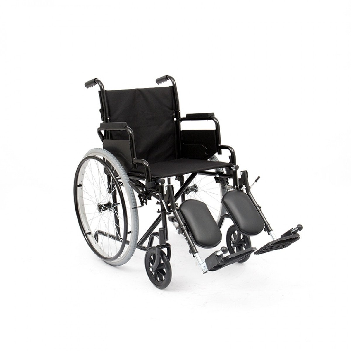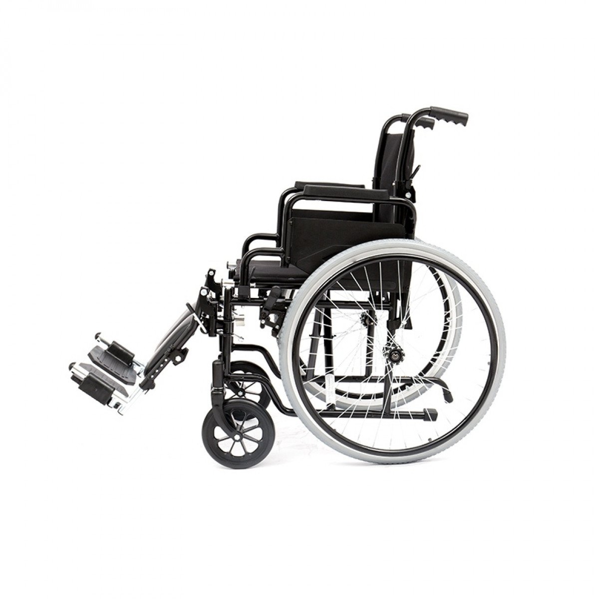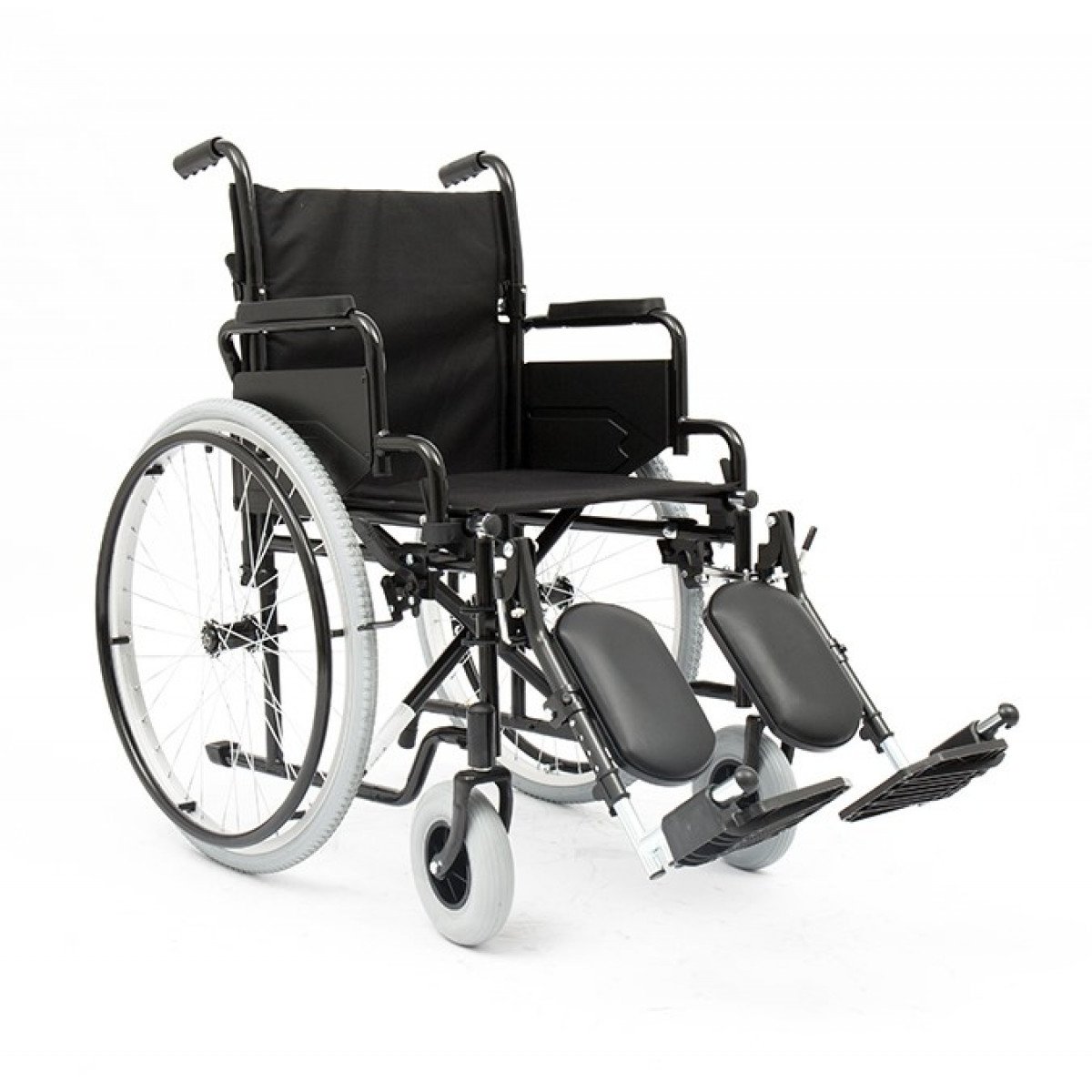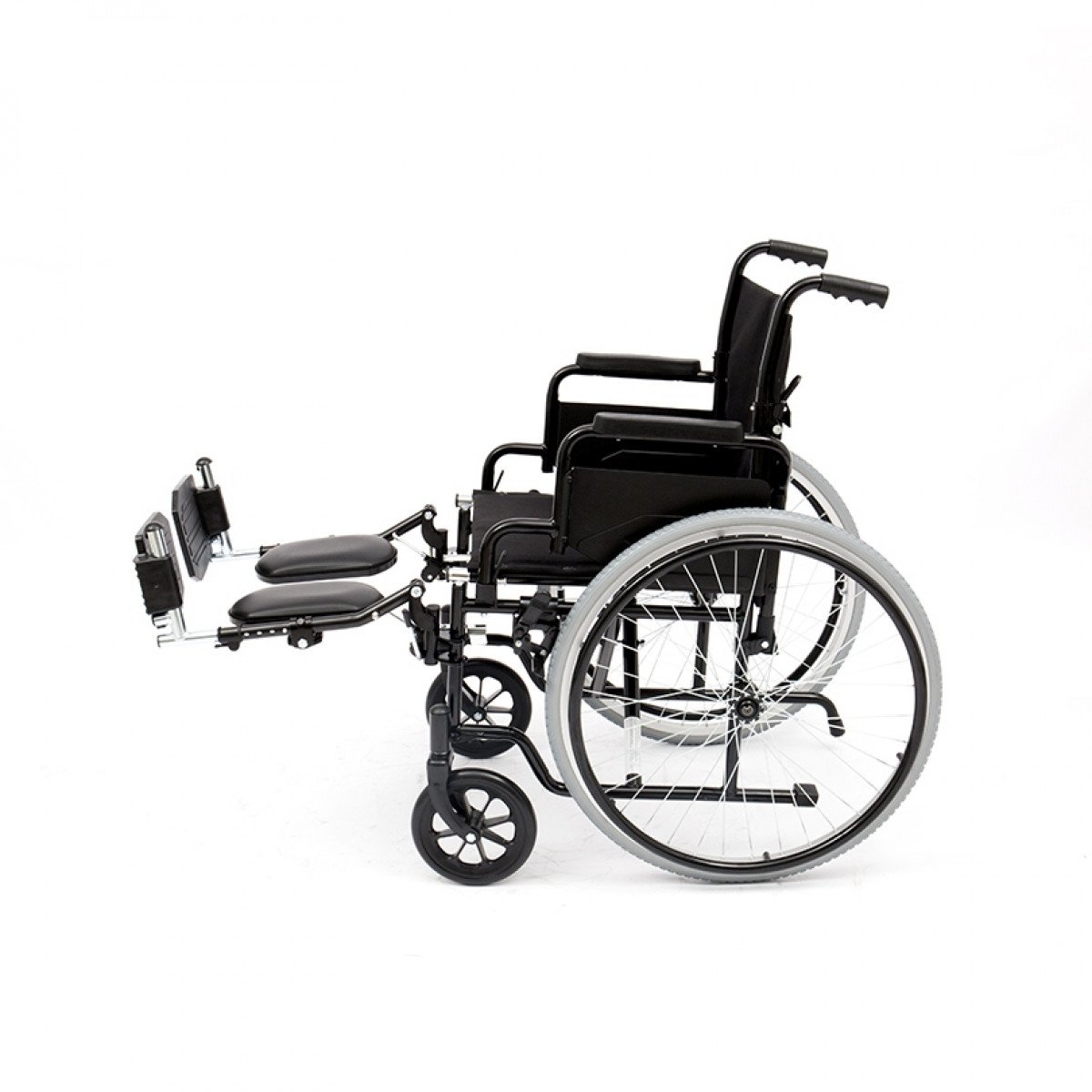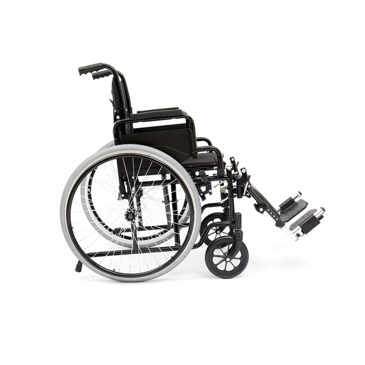 Задние колёса быстросъёмные, с кнопочной фиксацией — их можно быстро снять при необходимости. Доступны варианты с цельнолитыми или пневматическими шинами. Подножки — съёмно-откидные, регулируются по углу наклона, а ложементы под икроножные мышцы настраиваются по высоте, помогая правильно расположить ноги. Конструкция прошла необходимые испытания и рассчитана на безопасную регулярную эксплуатацию.