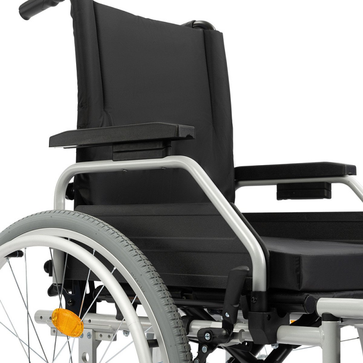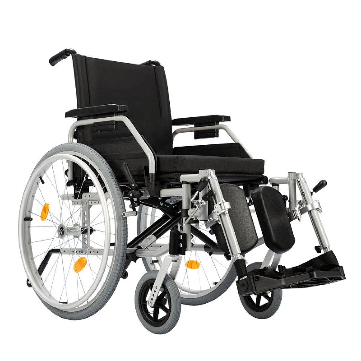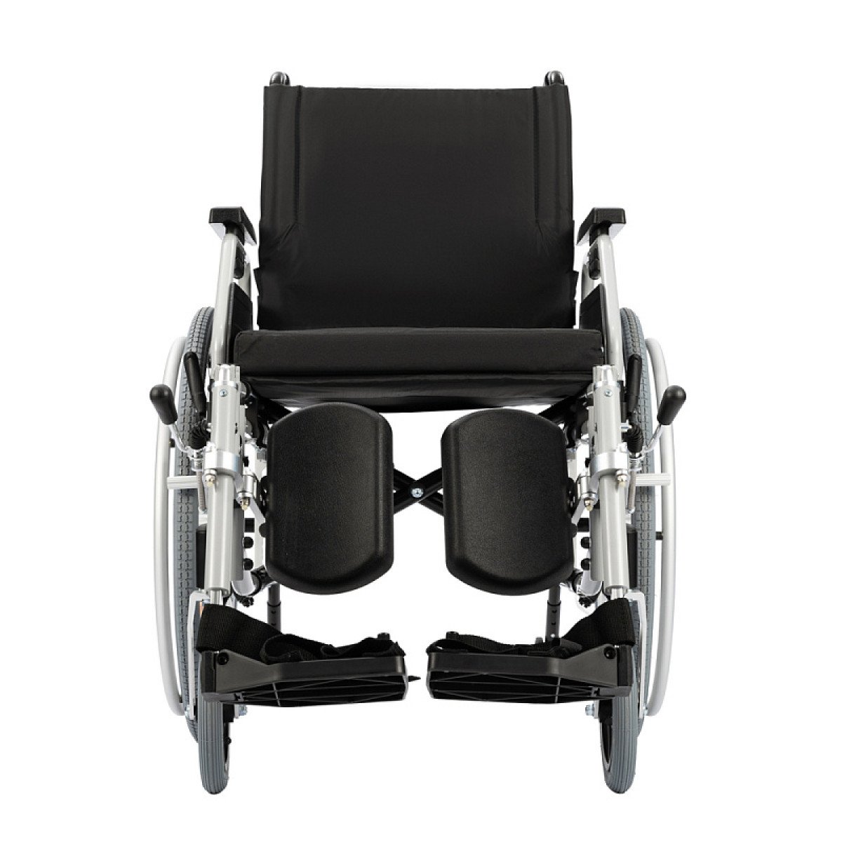 Подножки настраиваются по длине и углу наклона, дополнены мягкими опорами для голени — это важно при восстановлении после травм нижних конечностей. Подлокотники регулируются по высоте, откидываются или снимаются, облегчая пересаживание.