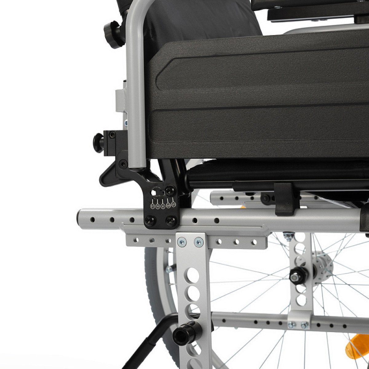 Коляска регулируется по ключевым параметрам: спинка — по высоте и углу наклона, сиденье — по высоте, глубине и углу. Это позволяет адаптировать посадку под индивидуальные особенности и обеспечить комфорт даже при длительном использовании.