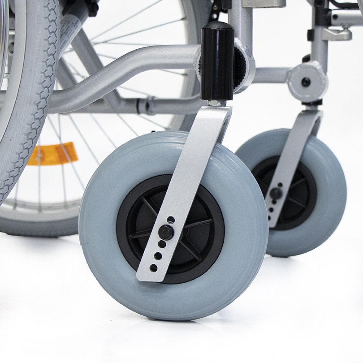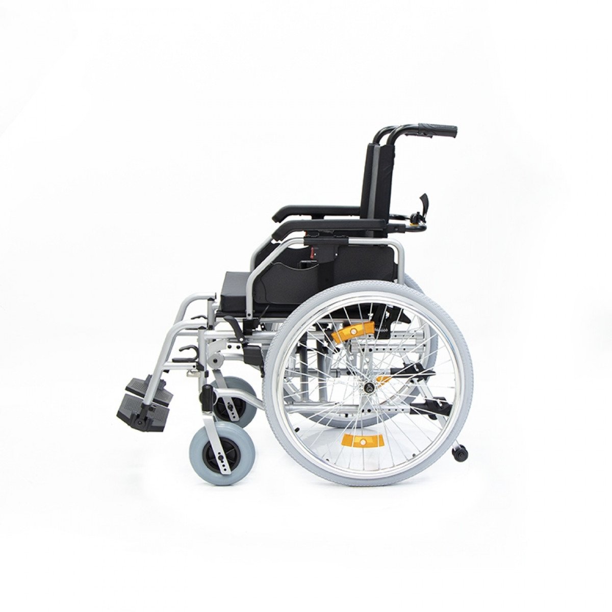 Коляска оснащена передними цельнолитыми колёсами с регулировкой по высоте и задними пневматическими колёсами, которые можно быстро снять и отрегулировать под пользователя. Складная рама из алюминия облегчает хранение и транспортировку. Для безопасности предусмотрены стояночные тормоза, жёсткая фиксация спинки и антиопрокидыватели с регулировкой, которые повышают устойчивость при движении.