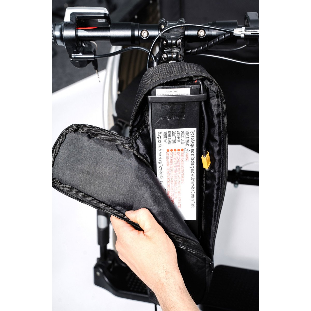 Приставка подходит людям со слабыми руками благодаря автоматической функции движения назад и круиз-контролю, который позволяет зафиксировать скорость одним нажатием кнопки. Широкий руль обеспечивает стабильный контроль направления, а складная конструкция делает хранение и перевозку проще. Съёмный аккумулятор можно заменить за несколько секунд без инструментов.