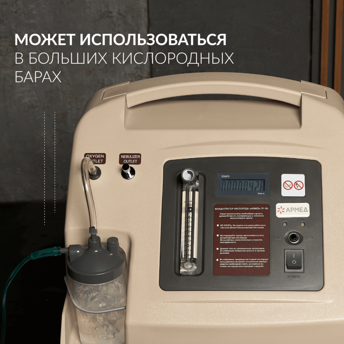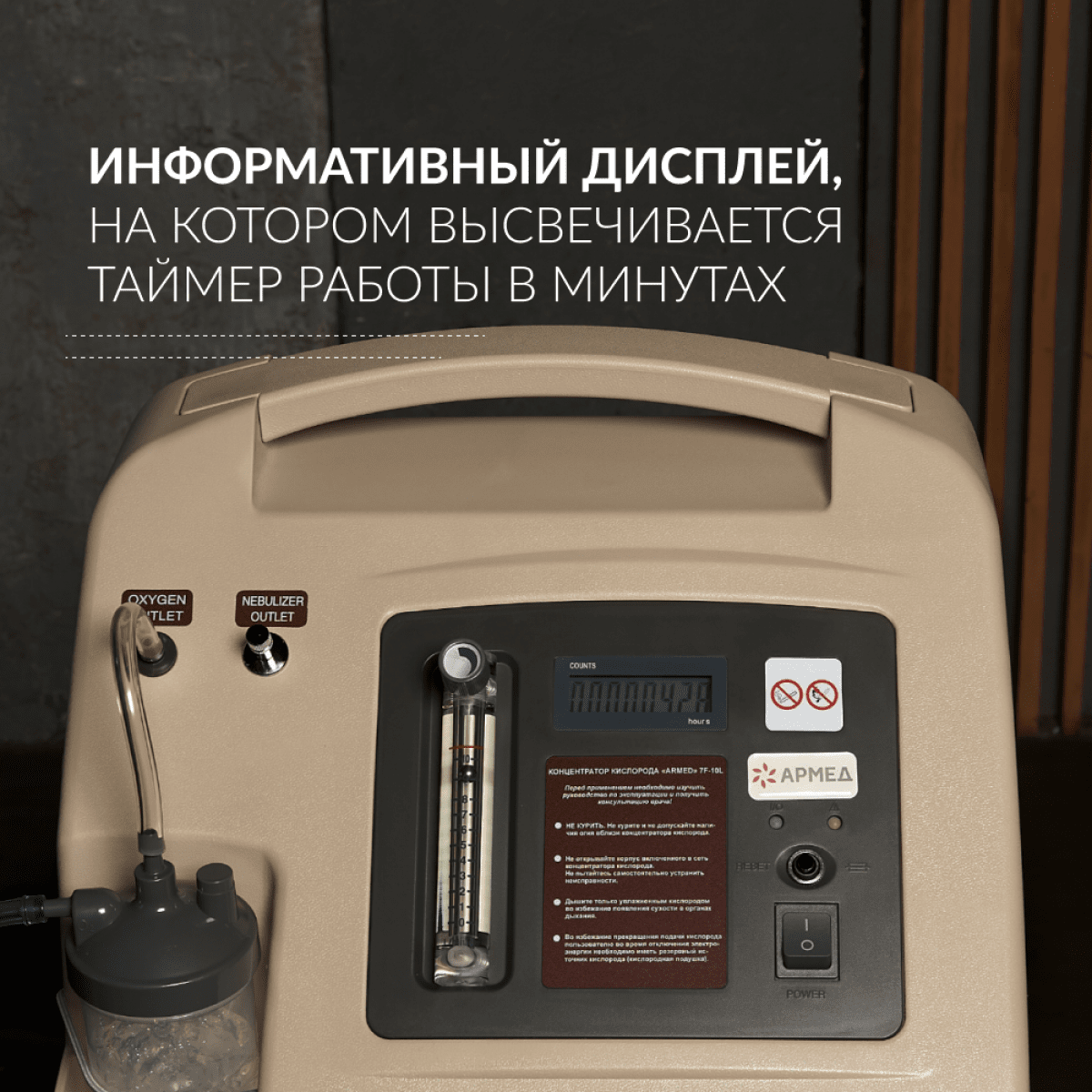 Кислородный концентратор Armed 7F-10L (Армед 7Эф-10Эль) — это современный медицинский аппарат, который производит чистый кислород, выделяя его непосредственно из окружающего воздуха. Устройство предназначено для проведения кислородной терапии в лечебных, профилактических и реабилитационных целях. Прибор обеспечивает высокую концентрацию кислорода до 95%, отфильтровывая азот и примеси без изменения состава воздуха в помещении.