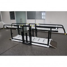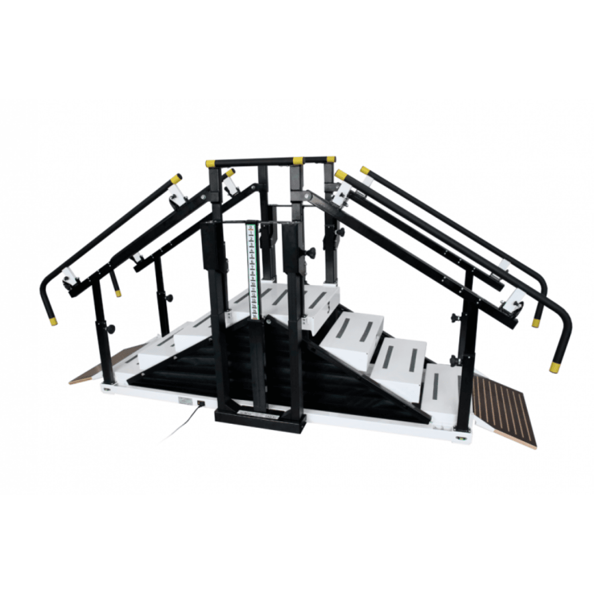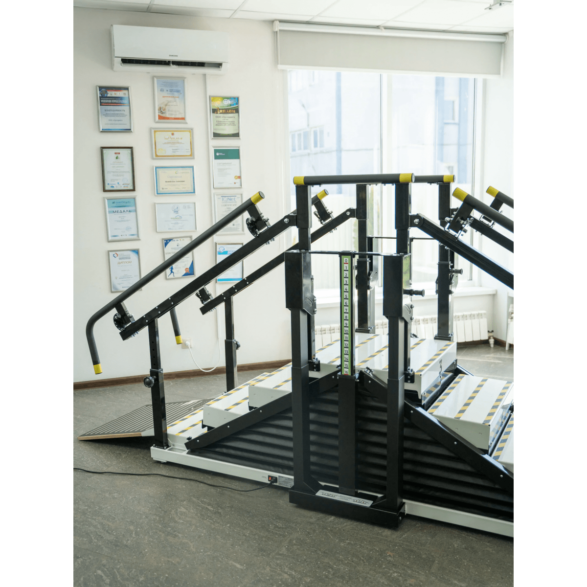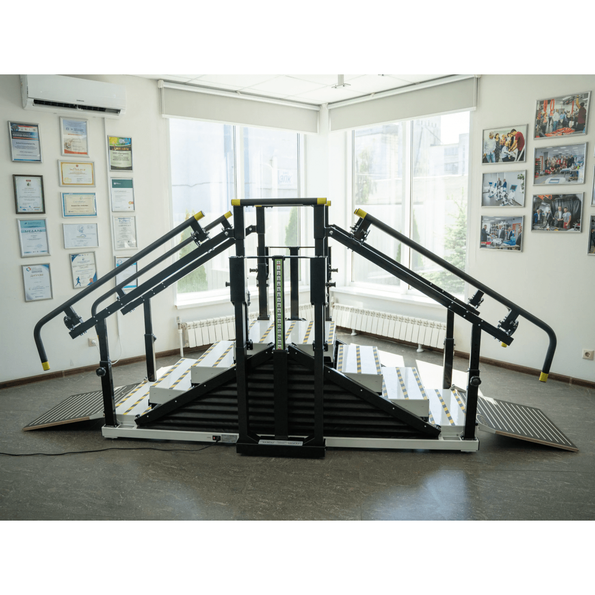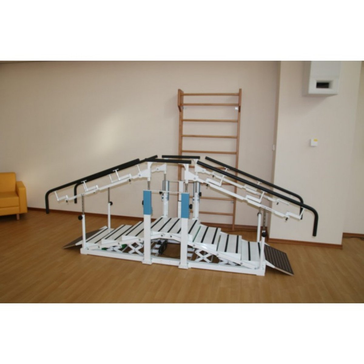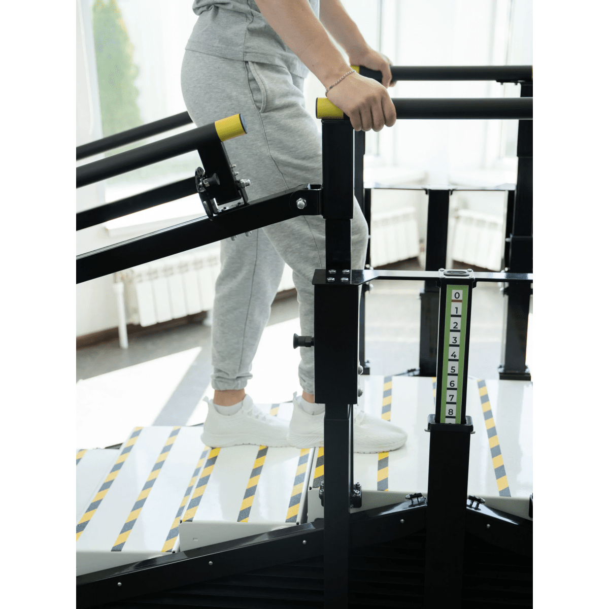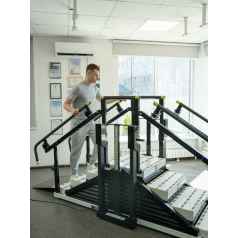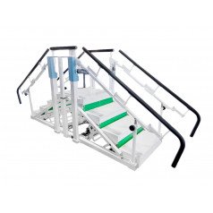 - Лестница. Тренажёр включает лестницу с четырьмя ступенями, имеющими противоскользящее покрытие, что обеспечивает безопасность во время занятий. Каждая ступень легко адаптируется к индивидуальным потребностям пациентов, позволяя им проходить этапы реабилитации с учётом их возможностей.