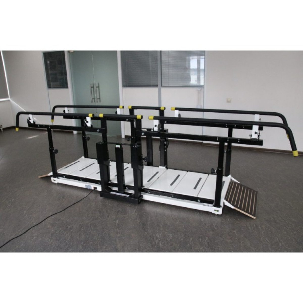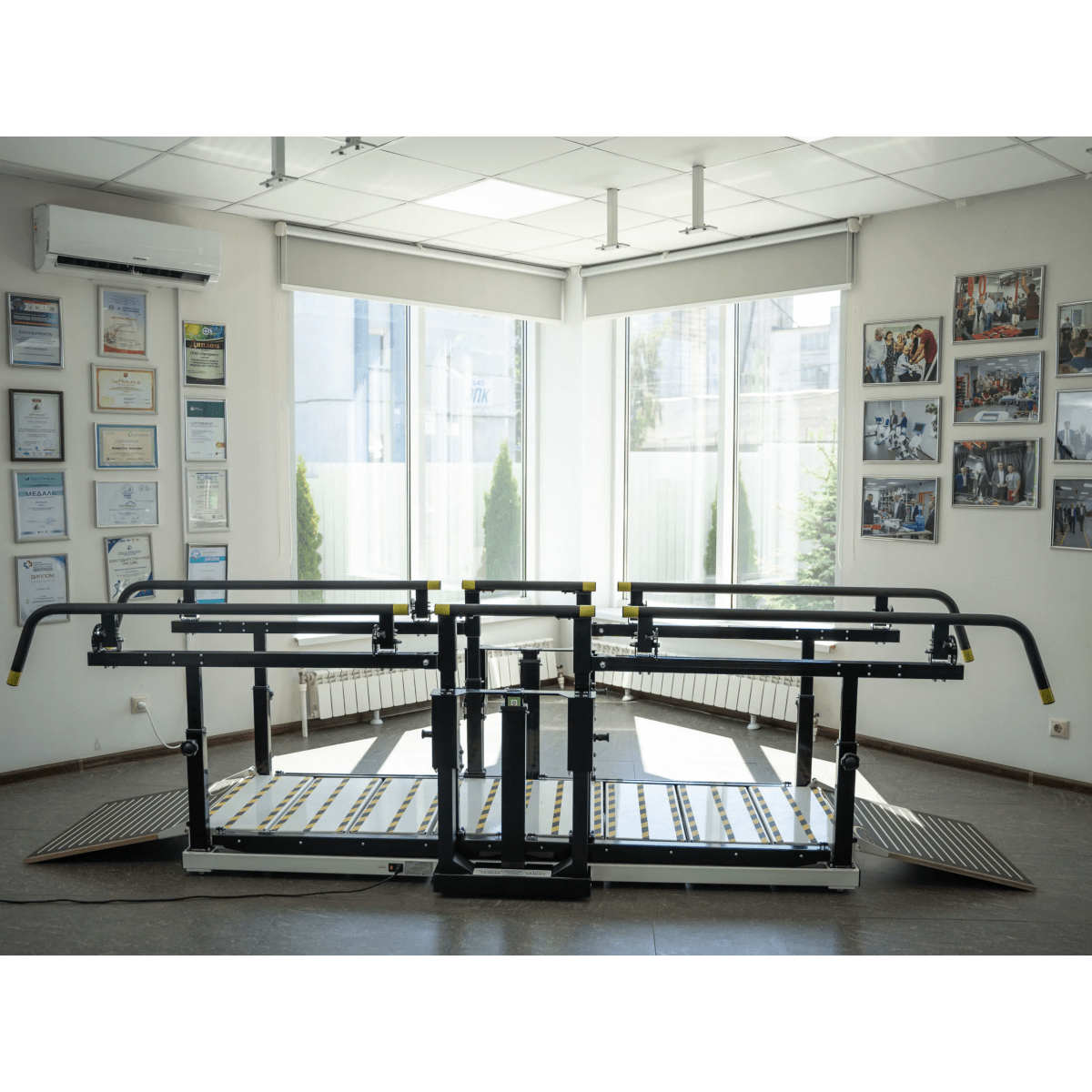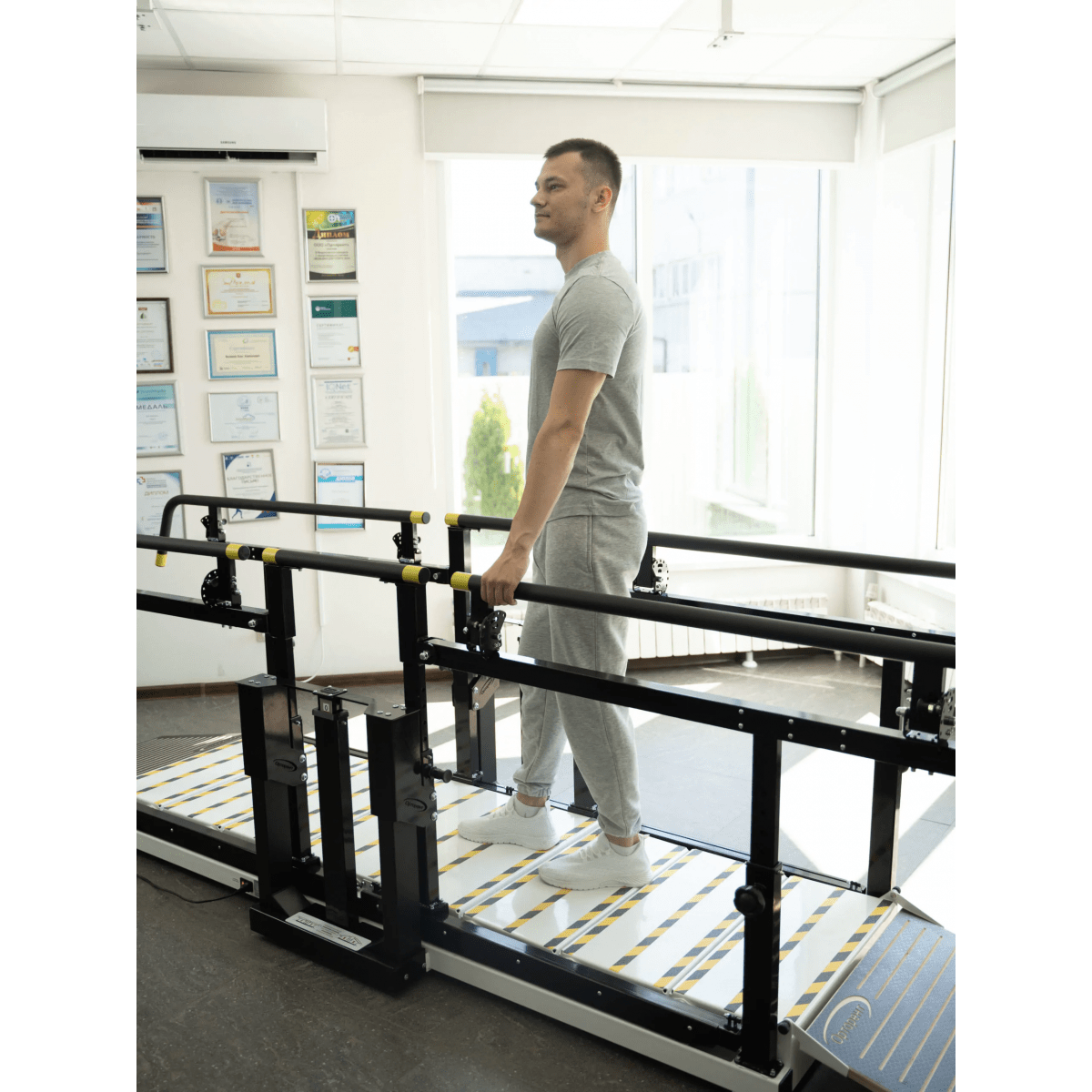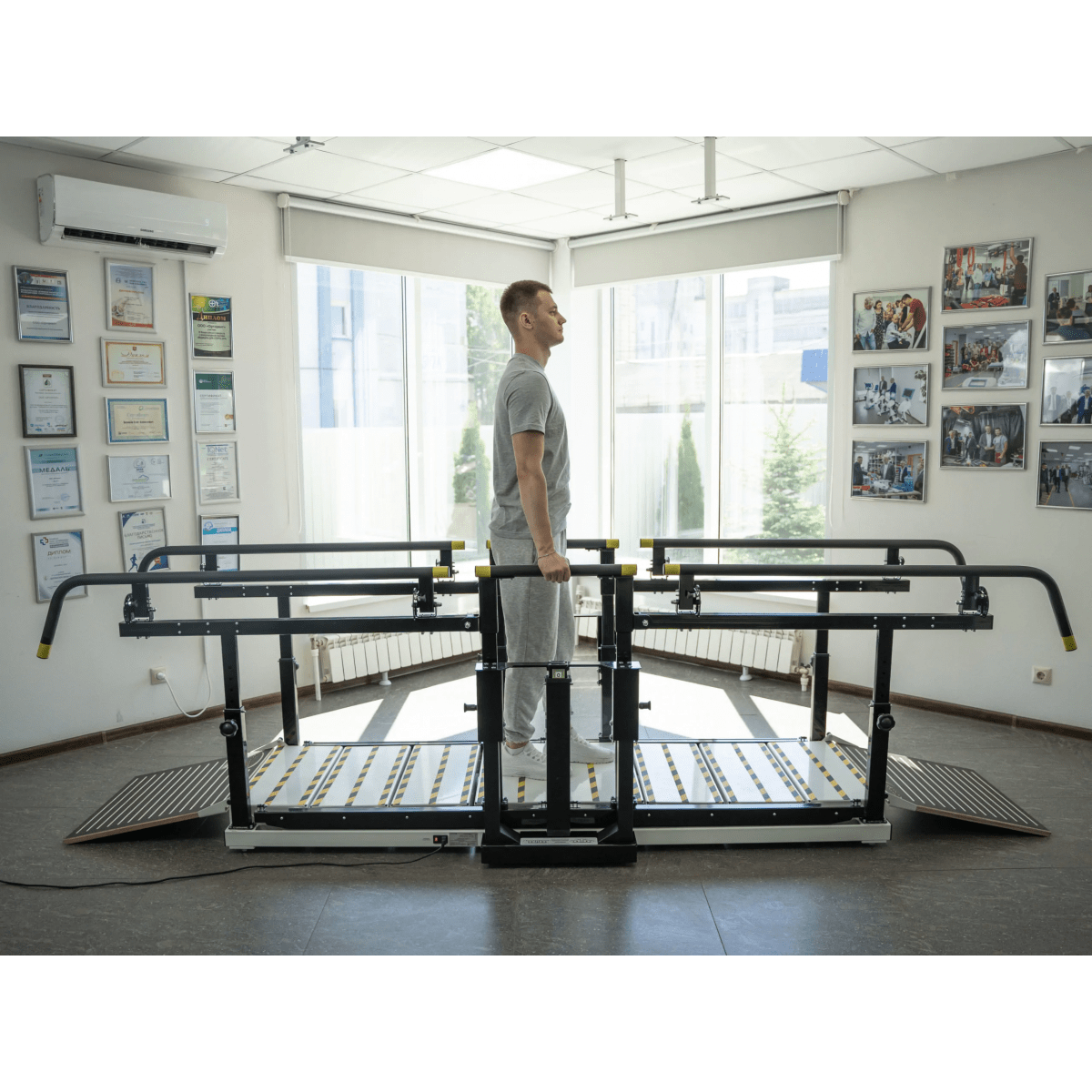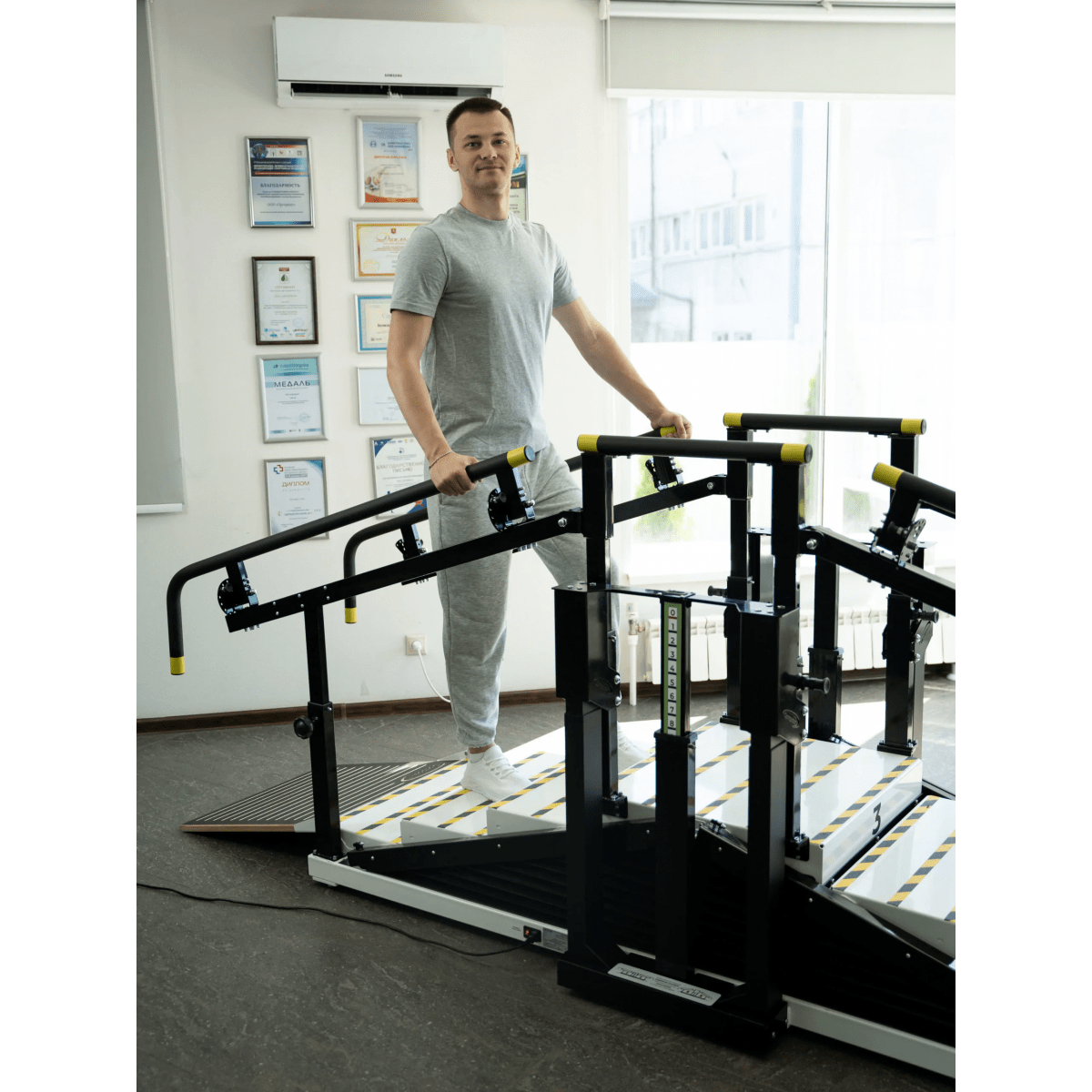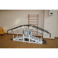 - Два вида тренировок: ходьба по горизонтальной поверхности с опорой на брусья и подъём по лестнице